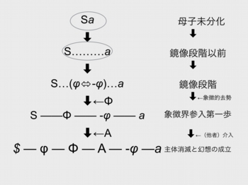 以後主体は、S1→S2(Φ→A)という連鎖を通して間接的にしか対象a を希求してゆくことができない。主体は a を求めてΦ→Aという象徴の連鎖を構築し、AをΦの隠喩として構造化する。こうしてΦの隠喩を受けた精神という「動的構造」が、$ ◇ aというファンタスムの磁場のなかで生成する。(「構造の病」『人間という症候』)
