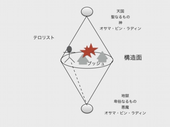 ではテロリズムはどうやって起こっているかというと・・・欲望のせめぎあいはこの平面(構造面)で起こっていますが、ここ(構造面)にテロリストがいるとします、そうしたらここ(上方もしくは下方)から指令がくるわけでしょう、で、バーンと爆発してしまうわけです、自爆、なにかというと・・・構造を破壊しているわけです。どうして破壊する力があるかというと、具体的に現われたテロリストの背後には、構造そのものを支えている、要するに構造から排除された位相があるからなのです。つまりテロリストを根絶するということは、構造そのものをなくすということぐらい不可能なことなのです。ブッシュはおそらく自分はここ(上方)にいると思っているのですが・・・違う・・・ここ(構造面)です。構造面にあるものが構造外のものを根本的にたたき出すことはできない。つまりテロは永遠に終わらないということです。(講義 藤田博史「セミネール断章」『セミネール通信2004年4月号)
