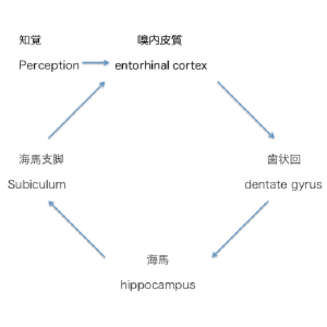 これを単純化して書くと(ホワイトボードに書く)entorhinal cortex,→dentate gyrus,→hippocampus→Subiculum、と伝達されてゆくこの回路。