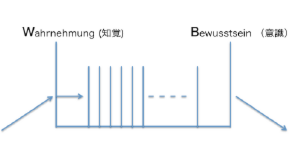 実は、フロイトが1900年に公にした『夢の解釈 Die Traumdeutung』の第7章に「心的装置」と呼ばれる図が出てくるのですが、この図は大変示唆に富んだ図でもあるのです。これはとても有名な何枚もレンズが挟まっている光学装置のような図です。この心的装置に向かって左から外的刺激が入ってくる。したがっていちばん左の端が知覚システムに相当します。知覚はドイツ語で Wahrnehmung なので、略してWと書きます。この知覚システムで最初の差異が作られる。作られた差異は知覚記号 Wahrnehmunfgszeichen として次の記憶システムに送られる。記憶システムは、何枚ものレンズで構成された光学器械のようになっており、そのなかを知覚記号(表象)が通過して、最後に運動として放出される。ここが意識 Bewusstsein ですね。だから頭文字を取ってW。これが有名なフロイトの心的装置の図です。