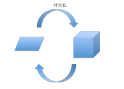 便宜的な描画法ですが、二次元を1枚の板のように描いて、三次元を立方体のように描いてみます。そしてここがBIですね。これが時空化されるわけです。