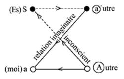 で、左上に大文字のSが書かれていますね。これは「主体 Sujet」を表すと同時に同音のドイツ語「それ Es」も表しています。ご存じのようにこのエスはフロイトの第2の局所論に出てくる心的審級です。その右横のa’ は「小文字の他者 autre」の頭文字です。次にこの小文字の他者の想像的な対として自我が「a」で表現されているので小文字の他者にはアポストロフィーが付いています。そして右下に「大文字の他者 Autre」の頭文字Aが書かれています。