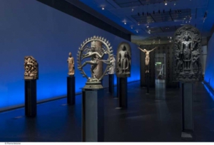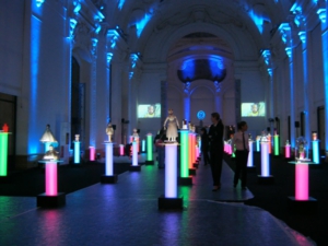 それでも、この展示(図1)は、標本を並べるように無機質な、典型的な博物館的展示の在り方とは一線を画しているように見える。なぜなら、神々の荘厳さ、神秘性を再現しようとする工夫のあとがほの暗い空間のなかに浮び上がる青色の照明から感じとれるからである。だが神々の壮厳さを損なわないようにという配慮は最終的には成功しない。なぜなら神々はこうした「平等」への配慮とはそれほど相性がよくないからである。ここでは神々は近代的な意味での「平等」や信教の「自由」を表わすかのように、平等に、そして異教の神々同士が隣り合わせに、なるべく中心を作らないように工夫されながら、並べられている。しかしそうすることによって逆にその奇妙さが際立ってしまう。なぜなら本来これらの像は、異教の神たちと同列に並べられることなど夢にも考えず、各々の神殿や教会で信仰の対象として仰ぎ見られるものであったはずだからである。