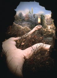 「見る」ことをテーマとした作品のなかでも少女を自らの視線のなかに収めることをテーマとした代表的な作品として、現代美術に関心のある人ならば、思い浮かべるであろう光景の一つにマルセル・デュシャンの遺作『(1)落ちる水、(2)照明用ガス、が与えられたとせよ』(1946−66)がある。フィラデルフィア美術館の古びた扉に穿たれた穴から覗きこむと、わたしたちが目にするのは白昼の白々とした風景の中に大きく股を広げて横たわる女性の手足と首を切断された裸のトルソである。もっともそれが切断されているかどうかは、観客が見るように仕向けられたその観賞用の穴を通してみる限りではわからない。わたしたちの視野は限定されていて、その範囲ではただ横たわる裸婦がいるだけだからである。首から上は見えず、首があるかないかは不明である。その身体はベルメールの人形と同様に陰毛の生えていないおそらくは未成年者の少女の身体であった。