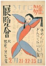 人形作家・堀柳女は1930(昭和5)年に竹久夢二と人形制作グループ「どんたく社」を結成して同年2月、銀座の資生堂ギャラリーにて「雛によする展覧会」(図1)を開いた。この時期に現れた創作人形作家の多くが、プロとしての人形職人からはじめて個人としての作家になった人たちであったとすれば、この展覧会に参加した人たちはアマチュアからはじめた人たちであった。既に著名であった竹久夢二がうしろだてになったことによって、それらの人形作品は「芸術」として認知されるようになったと言える。ただ竹久夢二の作品もまた、純粋芸術としてではなく、現代で言えばグラフィック・デザイナーの草分けとして、応用芸術として評価され、印刷物によってその名を広めていった。夢二と人形との出会いには堀柳女が大きく関わっているが、この堀と竹久夢二の出会いは少女雑誌『少女の友』の投稿欄の投稿者と選考者の関係にはじまり、文通を経て実際に会うという経過を踏んでいる。二人の出会いは雑誌というメディアの普及なしには考えられないものであった。この点で彼らの人形作家としての出発点は、徒弟制度からそのキャリアをはじめた人形職人出身の人形作家たちとは大きく異なるものであった。